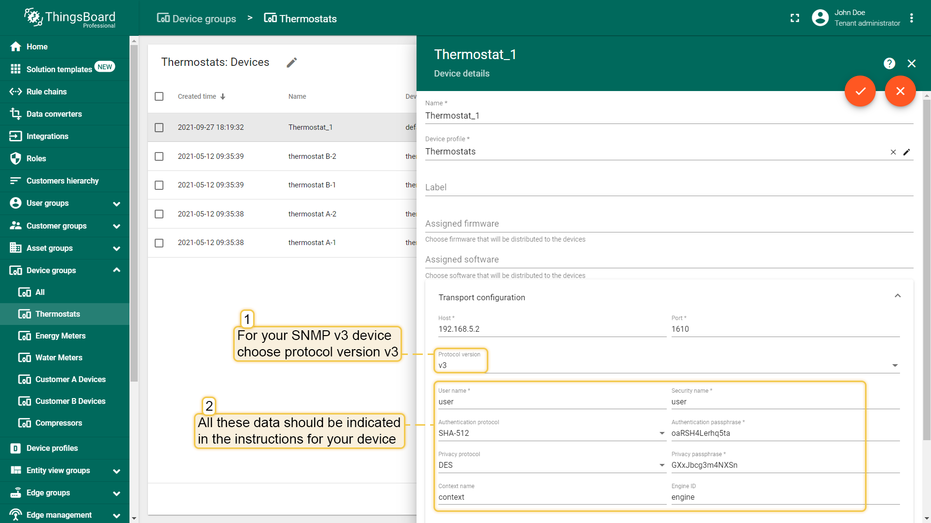 There are following properties to configure for your SNMP v3 device (in addition to host and port):