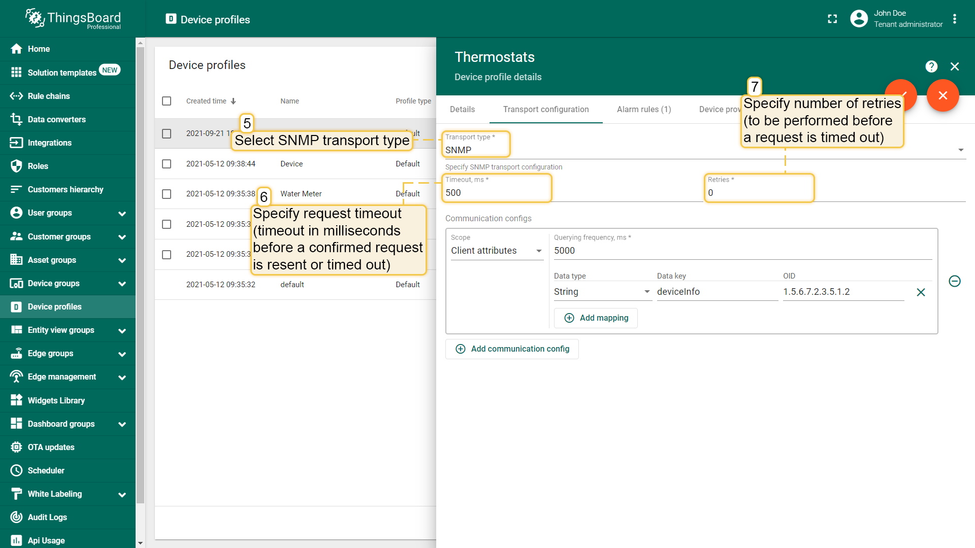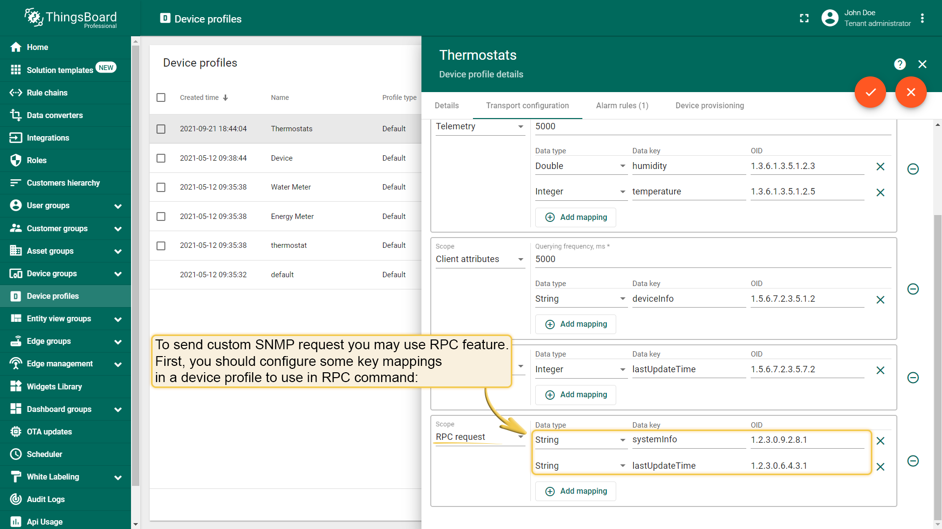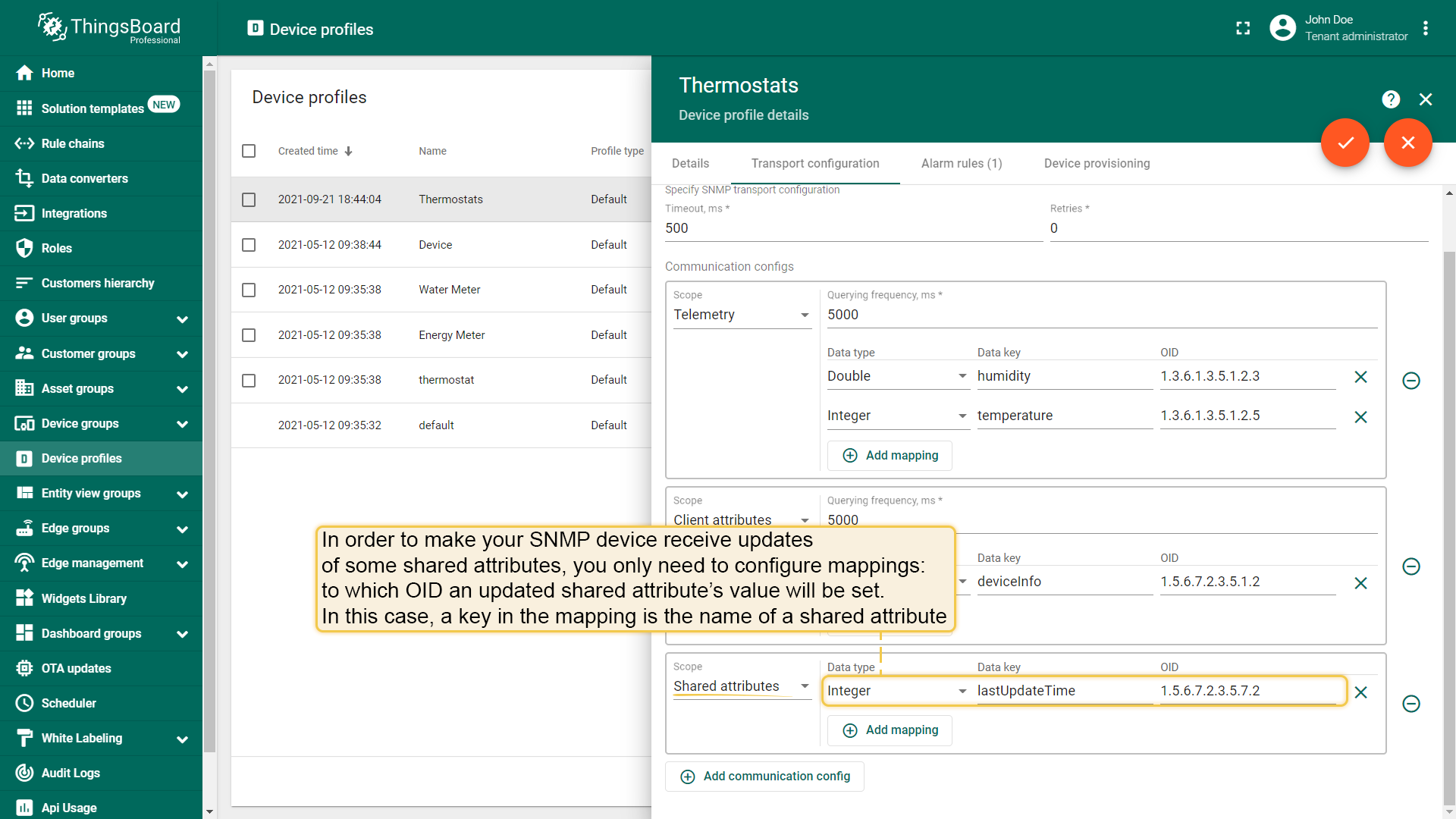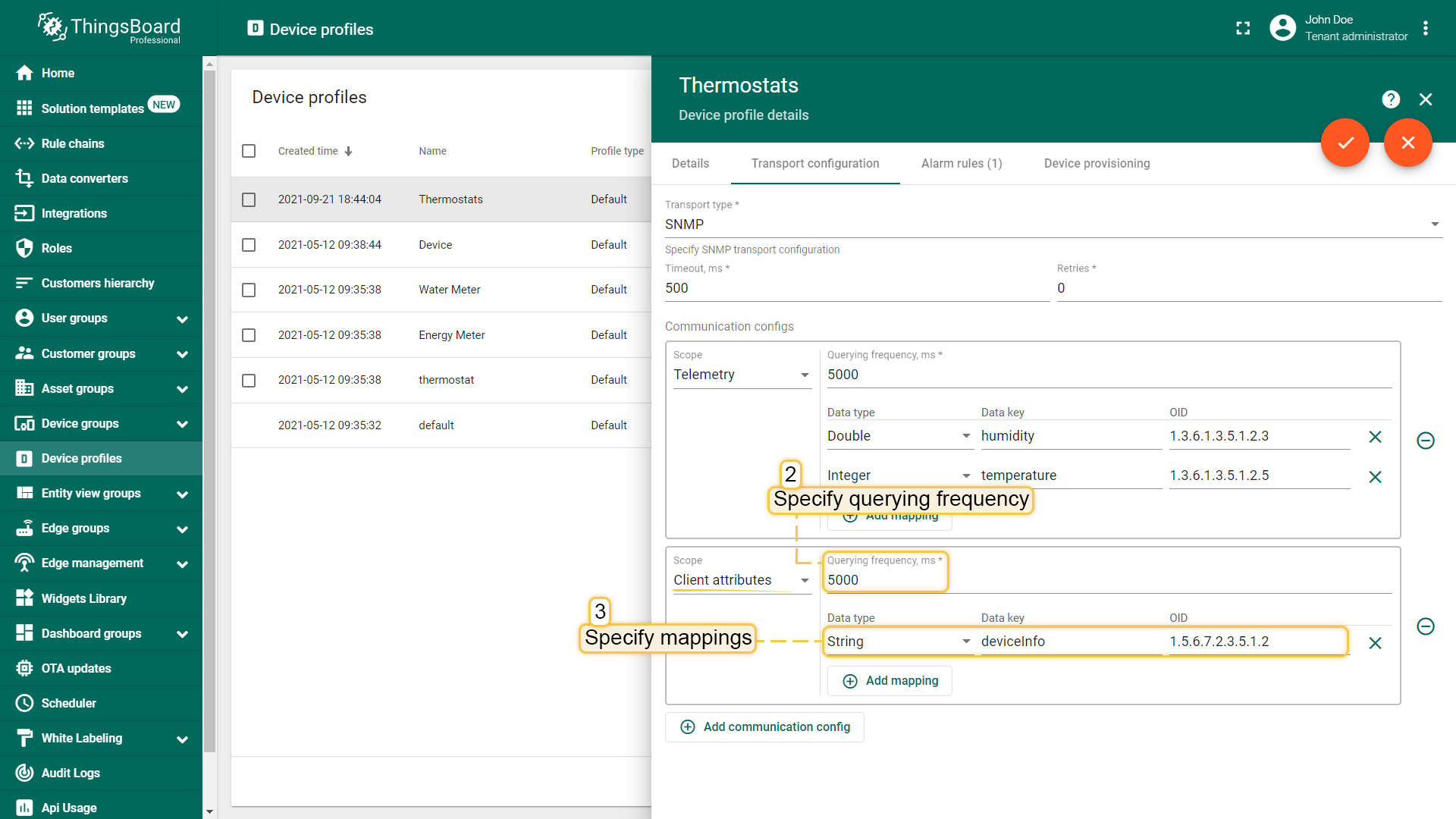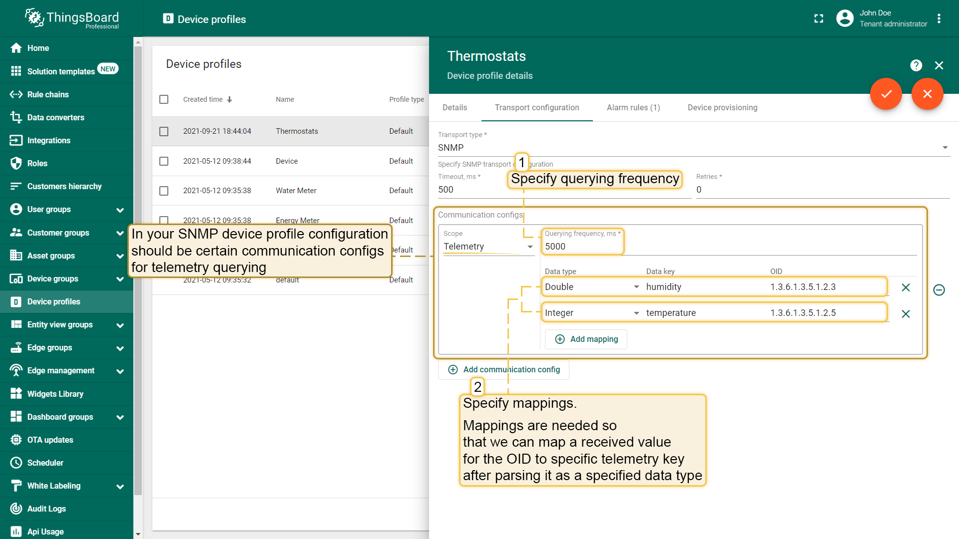 As was mentioned, there should be certain communication configs in your SNMP device profile configuration, and for telemetry querying you need to have one as well. For this type of config you have to specify some mappings and querying frequency. Mappings are needed so that we can map a received value for the OID to specific telemetry key after parsing it as a specified data type.