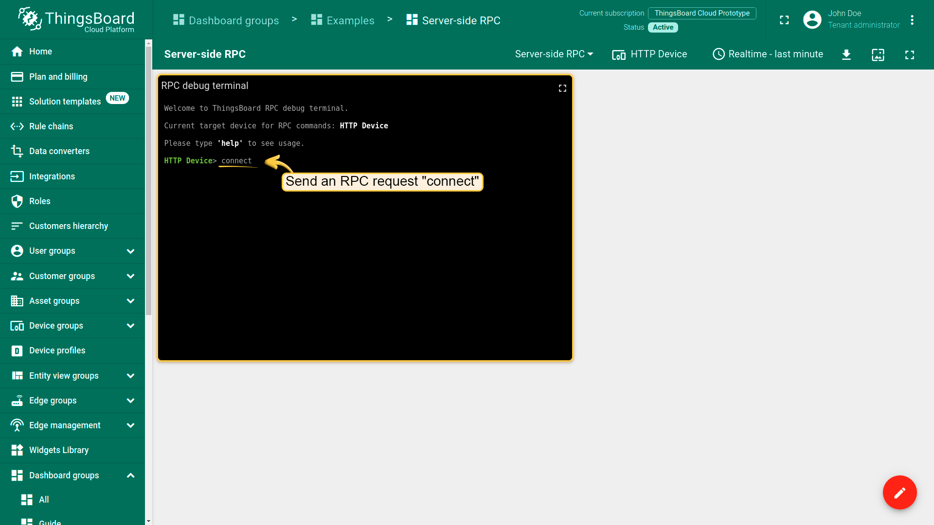 Send an RPC request “connect” to the device using RPC debug terminal widget;